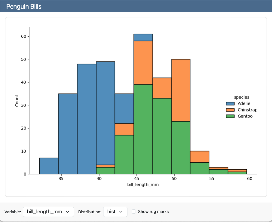 A screenshot of a Penguin Bills card. The card sidebar on the left contains two dropdown menus, one for Variable and one for Distribution and a checkbox to show rugmarks. To the right, a plot shows a histogram of bill_length_mm colored by species.